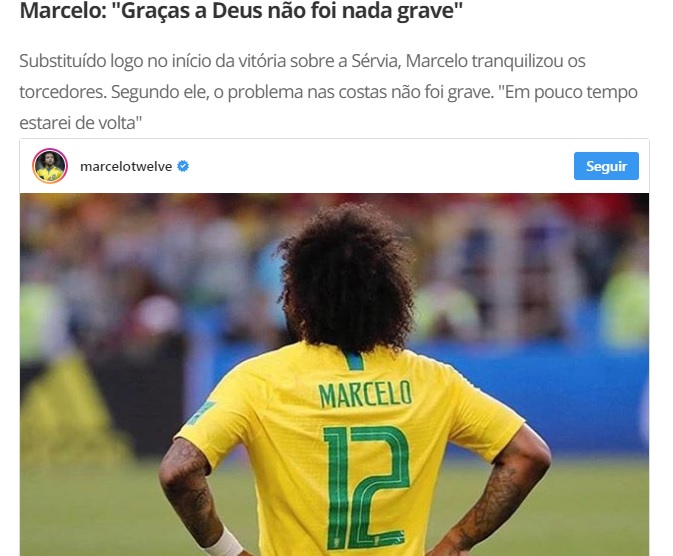Na vitória contra a Sérvia por 2 a 0, Marcelo pediu para ser substituído aos 9 minutos do primeiros tempo. O jogador deixou o gramado com dores nas costas.