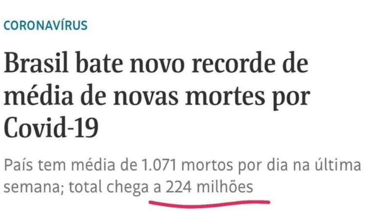 O jornal Folha de São Paulo voltou a ser motivo de piada entre os internautas. Ao atualizar, como de costume, o número de mortos da Covid-19 no Brasil, o veículo publicou que se tratava de um recorde em seis meses, chegando ao número de 224 milhões.