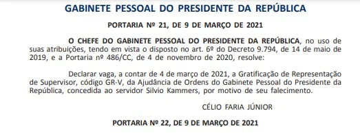 Portaria publicada no Diário Oficial da União do dia 10 de março declarou vaga, “a contar de 4 de março de 2021” a gratificação do servidor Silvio Kammers pelo cargo que ocupava, com a justificativa de “falecimento”.